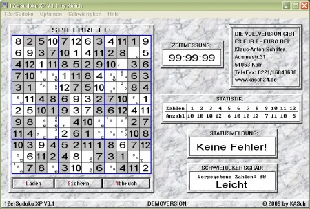 12erSudoku ist ein logisches und raffiniertes Zahlenrätsel, welches geeignet ist die logischen Fähigkeiten bei Jung und Alt zu trainieren. Mit dem Programm ist es möglich eine nahezu unbegrenzte Anzahl verschiedener Rätsel zu erzeugen, mit Zeitmessung zu lösen und mit Hilfe des Computers auf dem Bildschirm zu lösen oder auszudrucken. Man kann selbst eigene Rätsel (z.B. aus Zeitschriften) eingeben und vom Computer lösen lassen.