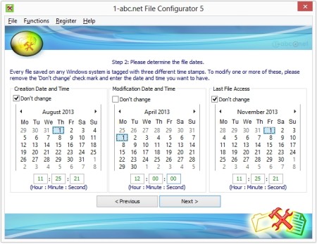 Mit dem 1-abc.net File Configurator lassen sich sogar Datei-Attribute ändern, die man üblicherweise nicht verändern darf. Windows speichert zwar die genauen Zeiten der Dateierzeugung, der letzten Dateiänderung und des letzten Zugriffs, manuell ändern lassen sich diese Angaben aber leider nicht. Die einfach bedienbare Programmoberfläche im Assistenten-Stil erlaubt es Ihnen, solche Daten nun schnell und einfach im Batch Modus zu bearbeiten.