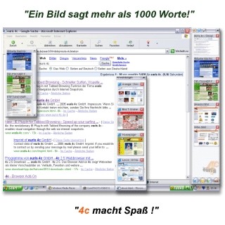 Das innovative Browser Add-on 4c unterstützt erstmalig das visuelle Gedächtnis. So schafft es 4c, die Visualisierung von Webseiten oder Favoriten in die Navigation einzubauen. Verkleinerte Ansichten von Webseiten machen kryptische URL´s entbehrlich. Seit dem Release 3.0 ist das visual tabbed browsing auch für den Desktop realisiert. Mit nur einem Klick haben Sie eine Vorschauübersicht sämtlicher Anwendungen, die Sie gerade nutzen.