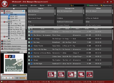4Videosoft iPod Manager macht es ganz leicht, Dateien von iPod zu Computer und auch Dateien von Computer zu iPod zu übertragen. Dabei können unter anderen Musik, Filme, Klingeltöne (nur iPhone, iPod touch), und Bilder übertragen werden.