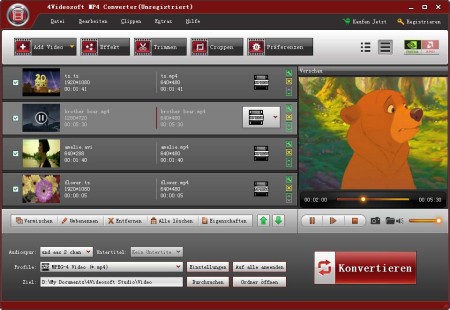 4Videosoft MP4 Converter ist ein professioneller Video to MP4 Converter, mit dem Benutzer nicht nur die gängige Video wie AVI, FLV, WMV, MOV, VOB, MKV usw. in MP4, H.264/MPEG-4 AVC(.mp4) sondern auch MP4 Videos in AVI, WMV, MOV, MP3 umwandeln können. Man kann auch Audiospur aus MP4 Video extrahieren und dann in AAC, AC3, AIFF, AMR, AU, FLAC, MP3, M4A, MP2, OGG, WAV, WMA umwandeln, um die Musik auf iPod, iPhone, iPad, PSP, PS3, Xbox usw. zu hören.