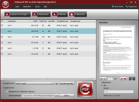 4Videosoft PDF to ePub Maker ist ein Programm, das Ihnen hilft, PDF Dateien in ePub zu konvertieren. Damit können Sie PDF Dateien als ePub auf Ihren tragbaren Geräten genießen. Außerdem lassen sich Bilder und Tabelle in den Originaldateien auch mit perfekter Ausgabequalität umwandeln.