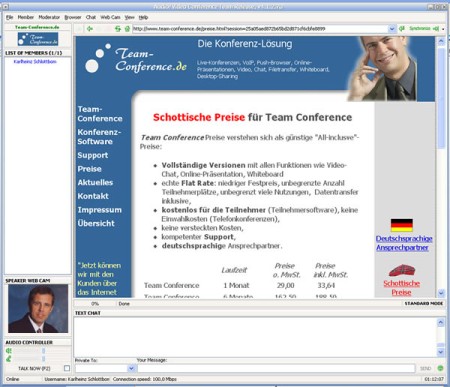 Team-Conference, eine neue Software für Web-Konferenzen mit Chat, VoIP, Video und Filetransfer. Hiermit werden Internet-Konferenzen hoher Qualität zu einem sehr günstigen Spartarif möglich. Bei deutlich mehr Funktionaliät ist diese Lösung deutlich billiger als Telefonkonferenzen. Die Software wird in Vertrieb, Support und zur Aufwertung von Internet-Angeboten ebenso eingesetzt wie für den privaten Chat mit Freunden.