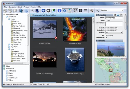 abeMeda ist eine Medien- und Datenbibliothek für fast alles was sich dreht - Festplatten, CD’s, DVD’s, ZIP’s... abeMeda erzeugt Kataloge von Ihren Medien und deren Metadaten und stellt sie zum Stöbern und Durchsuchen zur Verfügung. abeMeda ist crossplattform (mit neoFinder für den Mac), klein, schnell, leistungs- und (heterogen) netzwerkfähig.