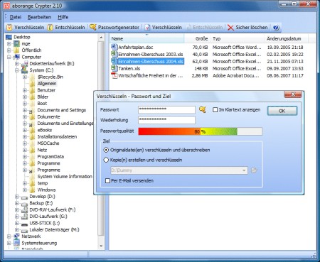 Verschlüsselung von Dateien, Texten und E-Mails nach dem hochsicheren Advanced Encryption Standard (AES-Verfahren). Integrierter Passwortgenerator zum Erstellen sicherer Passwörter. Sicheres Löschen von Dateien (Wiederherstellung nicht möglich).