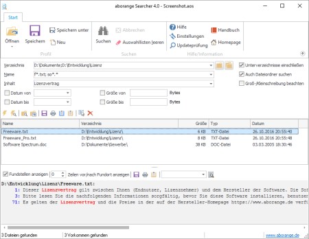 Software zur Dateisuche. Die Suche kann in einem Verzeichnis oder gleichzeitig in mehreren Verzeichnissen durchgeführt werden. Die Suchergebnisse werden in einer übersichtlichen und sortierbaren Liste ausgegeben. Der Suchvorgang kann über zahlreiche Parameter eingegrenzt werden, z.B. Dateiname, Dateigröße, Änderungsdatum aber auch nach Dateiinhalt (Volltextsuche).