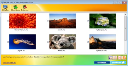 Ohne technisches Hintergrundwissen ist das Ändern des Windows Anmeldehintergrunds nicht möglich. Unter Windows 7 (ohne Starter) übernimmt die Software abylon LOGON-WALLPAPER-CHANGER dies für Sie. Laden Sie dazu einfach die gewünschten Bilder ins Programm. Diese werden nun optimiert und in das benötigte Format umgewandelt. Werden mehrere Grafiken geladen, so wird bei jeder Anmeldung ein anderes Bild angezeigt.
