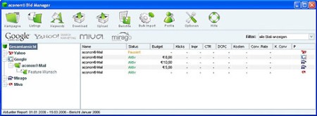 4 Anbieter – eine Oberfläche: mit dem Bid Manager können Textanzeigen und Sponsored Links bei den Providern Google, Yahoo!, Miva und Mirago erstellt