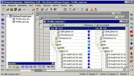 Haben Sie jemals versucht, einen Datenbestand von 100000 Dateien zwischen Notebook und Workstation synchron zu halten? AlaskaSync kann das und es ist kein abendfüllender Job. Nehmen Sie irgendein anderes Synchronisierungsprogramm - es wird sich schon bei 10000 Dateien für ewig verabschieden, nicht so AlaskaSync. Trotz enormer Datenflut behalten Sie den Überblick - die spezielle grafische Oberfläche macht es möglich. Probieren Sie es!