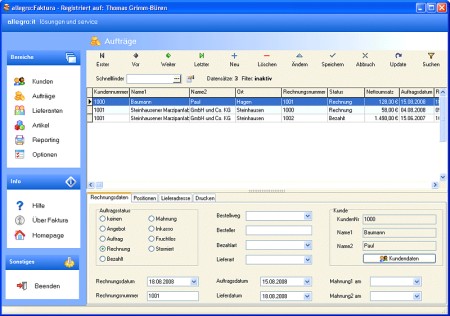 Die kleine aber feine Auftragsverwaltung. Mit Kunden-, Lieferanten- und Artikelverwaltung. allegro:Faktura ist in erster Linie für den Handel mit Waren konzipiert. Das heißt jedoch nicht, dass Sie nicht z.B. auch Dienstleistungen damit fakturieren können. Mit allegro:Faktura können Sie bequem Angebote, Auftragsbestätigungen, Rechnungen oder auch Mahnungen erzeugen. Sie behalten den Überblick über Aufträge, offene Posten, Mahnungen.