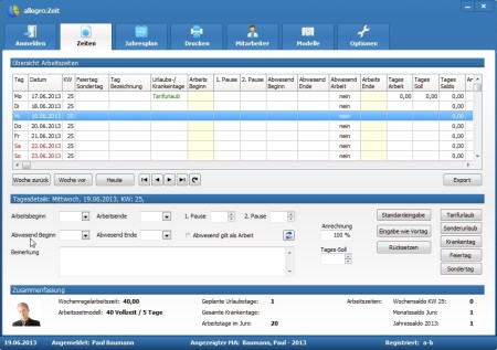 Arbeitszeitverwaltung einfach und schnell. Beliebig viele Jahrgänge und Mitarbeiter, individuelle Arbeitszeitmodelle. Jahresübersicht, Auswertungen, Benutzerverwaltung, Datensicherung