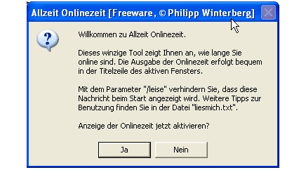 Allzeit Onlinezeit zeigt Ihnen an, wie lange Sie schon online sind. Die Ausgabe der Onlinezeit erfolgt bequem in der Titelzeile des aktiven Fensters. Wird die Verbindung getrennt, zeigt Allzeit Onlinezeit nichts an, sondern wartet, ohne Prozessorzeit zu beanspruchen, bis wieder eine Verbindung aufgebaut wird.