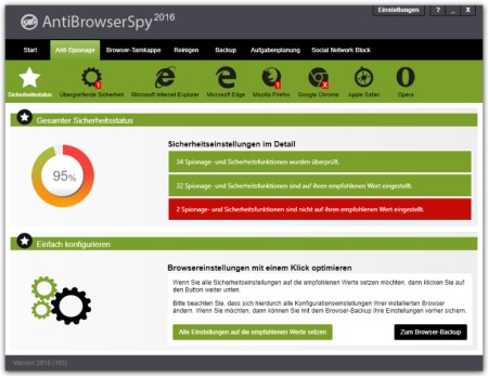 AntiBrowserSpy macht das Surfen sicherer. AntiBrowserSpy setzt der Neugier aktueller Browser ein Ende. Ob Microsoft Internet Explorer, Mozilla Firefox oder Google Chrome – Die meisten der heutigen Webbrowser funken Daten zurück zum Hersteller. Übertragen wird manchmal eine ID, manchmal die URL von Seiten, die nicht gefunden werden. Mit AntiBrowserSpy gibt es nun ein Werkzeug, mit dem die Sicherheit aller wichtigen Browser verbessert werden kann.