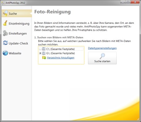 AntiPhotoSpy entfernt unerwünschte Nutzerdaten aus Bilddateien und schützt so Ihre Privatsphäre. Bilddateien enthalten oftmals versteckte Informationen, z.B. über Programme wie Photoshop, die Sie für die Bearbeitung verwendet haben. Auch Ihre Kamera und die GPS-Koordinaten des Aufnahmeortes sind häufig im Foto gespeichert.