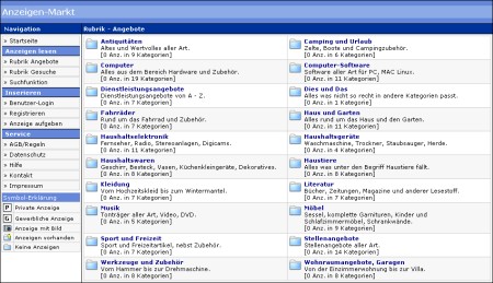 Die professionelle Software zum Aufbau von Ihrem virtuellen Marktplatz. Mit dem Anzeigen-Manager starten Sie in kurzer Zeit einen professionellen Anzeigenmarkt, der komplett in Ihre Website integriert werden kann. Die Software lässt Ihnen freie Hand bei dem Anpassen des Layout. Sämtliche Anzeigen-Kategorien können beliebig angelegt und bearbeitet werden. Ob als allgemeiner Anzeigenmarkt, Automarkt, Tauschbörse oder für andere Bereiche.