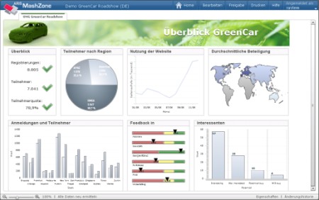 ARIS MashZone ermöglicht Anwendern aus Fachabteilungen die Erstellung von MashApps (Composite Applications) zur Auswertung verschiedener Daten. Mitarbeiter erhalten bessere Erkenntnisse und mehr Freiheit in der Aufbereitung entscheidungsrelevanter Kennzahlen.Typische Anwendungen, die mittels ARIS MashZone erstellt werden, sind z.B. Auswertungen von Marketingkampagnen, Wettbewerbsanalysen, Kundenzufriedenheitsanalysen o. finanzielle Analysen.