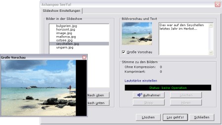 Ashampoo SeeYa! erlaubt es Ihnen, Ihre Bilder und Ihre Stimme in eine kompakte, \"sprechende\" Slideshow zu komprimieren. Zusätzlich können Sie die Bilder mit geschriebenen Texten unterlegen. Solche Slideshows bestehen hinterher aus nur aus einer einzigen Datei, die wahlweise als .exe oder .zip erstellt werden kann. Natürlich können Sie diese Datei auch direkt per E-Mail an Ihre Familie, Freunde oder Geschäftspartner verschicken.
