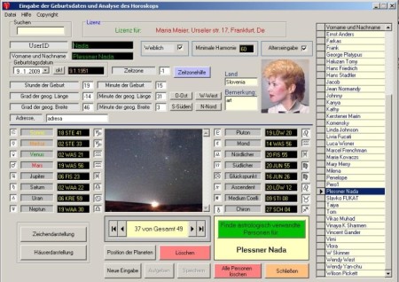 Unser astrologisches Programm AstroHarmonie berechnet die Übereinstimmungsmerkmale bei verschiedenen Personen und listet die Personen mit den meisten astrologischen Übereinstimmungen auf. Die Vorgehensweise ist einfach: Sie geben die Daten verschiedener Personen ins Programm ein und dann können Sie für jede einzelne Person eine Liste der "kompatiblen", d.h. verwandten Personen erstellen.