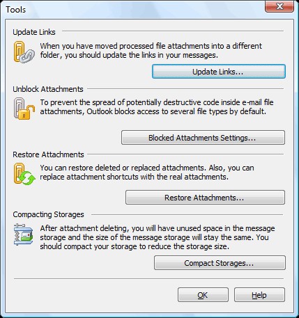 Das Programm hilft, Platz in der PST-Datei oder im Postfach auf dem Microsoft Exchange Server zu sparen und bietet zusätzlich auch noch eine Vielzahl an Möglichkeiten für die automatische Verwaltung der angefügten Dateien. Dieses Programm kann angefügte Dateien selbstständig aus den eingegangenen Emails herausziehen und sie auf der Festplatte speichern; die Anhänge in ausgehenden Nachricht automatisch mit ZIP-Format komprimieren.