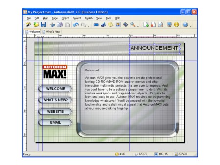 Autorun MAX ist ein professionelles Programm zur Erstellung von CD/DVD-Autorun-Menüs. Es können AutoPlay Menüs und CD-Visitenkarten ebenso erstellen erstellt werden wie Programmstarter und automatisch startende Softwareinstallationen. Kombinieren Sie Fotos, Musik, Text, Video und Software in Ihren AutoPlay / Autorun / Autostart CD/DVD-Menüs. Dazu sind keine Programmierkenntnisse sind erforderlich.
