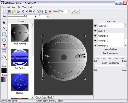 AVS Cover Editor ist ein kompaktes und vollfunktionelles Tool, die dem Benutzer eine Möglichkeit gibt verschiedene CD-Etiketten und Covers zu erstellen, sie zu editieren, drucken oder als grafische Files zu speichern.