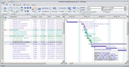 AxProject - ein unverzichtbares Werkzeug des Leiters bei der Planung und dem Projektmanagement. Dieses Programm wird Ihnen eine Vision des Projekts, mit der visuellen Darstellung aller Aufgaben, Kosten und Ressourcen bekommen zu helfen, weil das ein einfaches, zugängliches Programm ist. Sie können einfach und schnell die Kosten und den Zeitplan berechnen, kritische Aufgaben identifizieren, rational Belastung der Ressourcen (Leveling) verteilen.