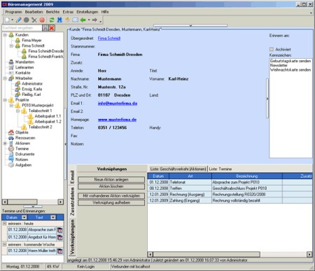 Büromanagement 2009, die Software für eine effektive Büroorganisation, zur Verwaltung aller Beziehungen Kunden,Mandanten,Lieferanten,Kontakte), zur Verwaltung der Unternehmensdaten (Projekte, Objekte, Mitarbeiter, Ressourcen), zur Erfassung und Auswertung der gesamten Korrespondenz (Telefonate, Dokumente, Termine, Schreiben, Gespräche, ...), individuell und kinderleicht anpassbar durch Kennzeichen & beliebige Zusatzdaten