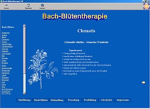 Umfassende Einführung in die Bach-Blütentherapie mit Beschreibungen und Abbildungen aller 38 Bach-Blüten, Diagnose - und Behandlungshinweisen sowie Informationen über die Ergebnisse neuerer Forschung. Selbstlaufendes Windows-Programm mit Volltextsuche. Keine Installation erforderlich.