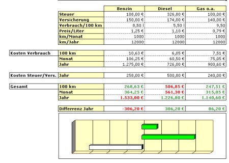 Jeder kennt das: Ein neues Fahrzeug soll (muss) angeschafft werden! Auf welche Kraftstoffart soll die Wahl fallen? Diese kostenlose Tool kann Ihnen bei der Entscheidung helfen. Berechnen Sie die anfallenden Kosten anhand Ihrer persönlichen Daten (zu fahrende km/Jahr, Steuer, Versicherung etc.). Bis zu drei verschiedene Kraftstoffarten lassen sich vergleichen (Benzin, Diesel, Gas oder andere).