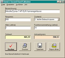 Bernie’s Second Hand Kalkulator ist ein Branchentool für den Handel mit Gebrauchtwaren. Die Anwendung ermittelt den Zeitwert von gebrauchten Wirtschaftsgütern, Geräten und Maschinen, und den sich daraus ergebenden Ankaufspreis für den gewerblichen Weiterverkauf. Sie richtet sich damit an Kaufleute im Einzelhandel, die einen An- und Verkauf von Gelegenheiten durchführen. Die Ergebnisse lassen sich drucken, speichern, bearbeiten und exportieren.