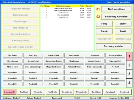 Bistro-Cash ist eine benutzfreundliche Kassensoftware, die besonders für Bistros, kleinere Gaststätten oder Cafes konzipiert ist. Die Oberfläche der Software ist nicht mit Funktionen überladen, sondern besitzt alles Wichtige, was Sie so bei der täglichen Arbeit benötigen. Die Oberfläche ist für den Touch-Screen Einsatz optimiert, lässt sich aber genau so gut über eine normale Maus bedienen.