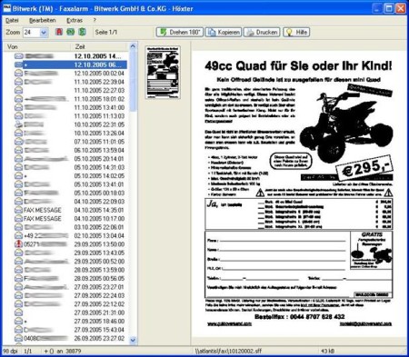 Bitwerk Faxalarm meldet und druckt Faxe innerhalb des lokalen Netzwerks, die mit der Fritz!Fax-Software zentral empfangen wurden. Somit kann man Fritz!Fax als preisgünstigen Faxserver verwenden und mit Faxalarm alle Faxe individuell verwalten. Vereinfachen Sie Ihre Faxverwaltung durch Einschränkung auf relevante Faxe per MSN-Filter, Suche nach Faxen über die Absenderkennung oder Weiterleitung von Faxen per Email.