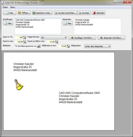 Bedrucken Sie Briefumschläge mit Ihrem Drucker. Geben Sie einfach Empfänger und Absender ein und drücken Sie den Drucken Knopf. Es kann auch die Schriftart und Größe eingestellt werden und eine Grafik mit ausgedruckt werden. Die Briefumschläge können mit allen Einstellungen gespeichert und später wieder geladen werden. Es können Briefumschläge für alle Empfänger in einer CSV Datei per Knopfdruck ausgedruckt werden.