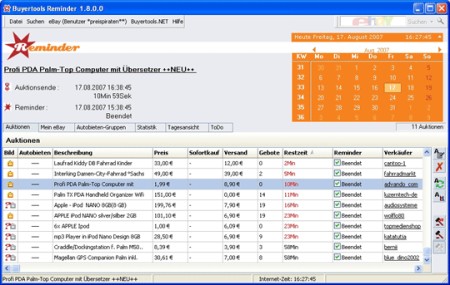Der Buyertools Reminder reagiert nun schneller auf serverseitige Fehler und die Importfunktion \"Mein eBay\" wurde optimiert. Er platziert weiterhin sekundengenau zum festgelegten Zeitpunkt Ihr Gebot und auf Wunsch stellt er rechtzeitgig vor Gebotsabgabe automatisch eine Internetverbindung her. Natürlich können Sie auch weiterhin manuell aus dem Programm bieten; der Reminder macht Sie rechtzeitig auf das Auktionsende aufmerksam.