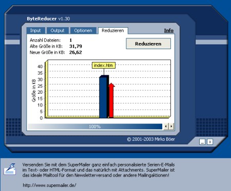 Mit ByteReducer optimierte HTM/HTML-Dateien werden von Browsern um bis zu 60% schneller geladen als nicht optimierte Dateien. Dabei verändert sich das Erscheinungsbild der Website überhaupt nicht. \"Wie ist das möglich?\", werden Sie sich fragen. Ganz einfach: ByteReducer ersetzt Teile des Quellcodes durch kürzeren Sourcecode, der denselben Effekt hat. Desweiteren werden Konstanten für lange Ausdrücke verwendet und unnötige Zeichen entfernt.