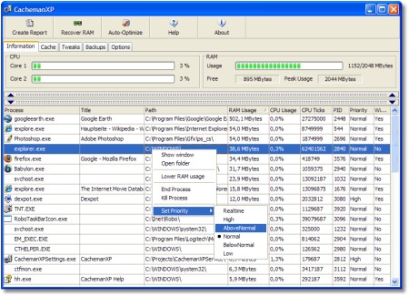 CachemanXP ist eine Windows Tweak-Software mit der Zielsetzung die Geschwindigkeit und Stabilität ihres Computers durch die Optimierung von einigen Caches, Wiederherstellung des Arbeitspeichers und Feineinstellung verschiedener System-Einstellungen zu erhöhen. Durch Ein-Klick-Optimierung ist es leicht zugänglich für Computer-Novizen, jedoch auch vielseitig genug um Computer-Experten zufrieden zu stellen.