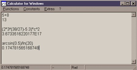 Leistungsfähiges und konfortabeles Taschenrechner-Programm. Die Eingaben erfolgen in einem Text-Editor. Dies ist sehr nützlich bei längeren Fromeln. So hat man die vollständige Eingabe ständig im Blick und kann etwa bei Tippfehlern den Fehler sehr einfach korrigieren.