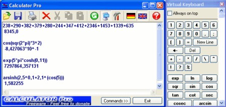 Calculator Pro ist ein mathematisch, wissenschaftlicher Windows-Rechner, der umfangreiche mathematische Ausdrücke berechnen kann. Dafür unterstützt er Matrizen-Rechnungen, komplexe Zahlen, das Zeichnen von Diagrammen und Kurven, einfache Animationen, das Umrechen von Einheiten und vieles mehr. Der Calculator Pro basiert auf einem mehr-zeiligen Textfeld, das eine einfache und transparente Handhabung gewährleistet.