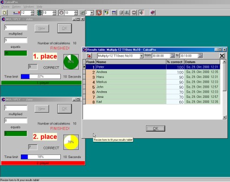 CalculPro hilft Ihren Schülern Kopfrechnen oder Bruchrechnen zu üben. Wählen Sie Addieren, Subtrahieren, Multiplizieren, Dividieren oder Bruchrechnen; setzen Sie den Zahlenbereich und die Anzahl Rechnungen für eine Übung fest. Das Programm zeigt Ihnen zwei Zahlen bzw. Brüche, und Sie geben eine Antwort ein. Richtige und falsche Antworten bewirken eine Audio - Rückmeldung. Graphisch können Sie die Anzahl richtiger Antworten in Prozent ablesen.