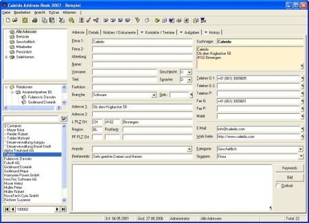 Caleido Address-Book ist die perfekte Adress- und Kontaktverwaltung für kleine und mittlere Firmen, fürs Home-Office, für den Verein oder für den anspruchsvollen Privatanwender. Auf einer übersichtlichen Oberfläche sind alle adressbezogenen Informationen wie E-Mails, Notizen, Dokumente, Termine und Aufgaben vereint. Caleido Address-Book ist einfach, preiswert und bietet alle Funktionen, die Sie benötigen, ohne überladen zu sein.