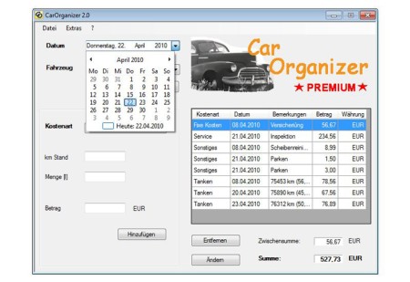 CarOrganizer ist ein Programm zur übersichtlichen Darstellung der Ausgaben für Ihre Kraftfahrzeuge. Die Software berechnet detailliert den Kraftstoffverbrauch Ihrer Fahrzeuge und gibt Ihnen einen Gesamtüberblick der monatlich bzw. jährlich anfallenden Kosten. Weiterhin bietet Ihnen das Programm die Möglichkeit auf einfachste Weise ein Fahrtenbuch zu führen.