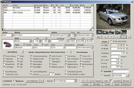 Die Verkaufsunterstuetzung für den ONLINE-Fahrzeughandel! Speziell für den Fahrzeughandel haben wir eine Loesung entwickelt, die einfach und bequem Gebraucht- und Neufahrzeuge verwaltet. Sie koennen nicht nur alle Fahrzeuge mit allen technischen Daten und Preisen erfassen, sondern auch Ihren Kunden optisch hochwertig praesentieren. Uebersichtliche Verwaltung von Neu- und Gebrauchtfahrzeugen - Ausstattung pro Fahrzeug per Klick - Preiskalkulation