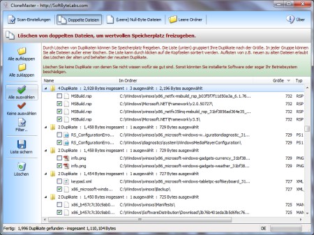 CloneMaster säubert Ihr Festplatte von doppelten Dateien, die nur Platz verschwenden. Er sucht nach ECHTEN doppelten Dateien (Byte für Byte) und listet sie Ihnen auf. Clonemaster findet Duplikate in verschiedenen Pfaden, Backuplaufwerken, Festplatten-, Floppy-, USB-Sticks, Jaz-, ZIP-, CDROM-, DVD-, abgebildeten Netzwerklaufwerken, usw.