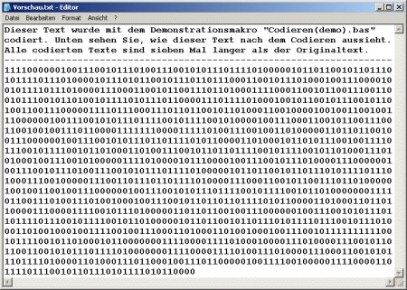 Mit Hilfe dieser Makros können Sie beliebige Texte in Einser und Nuller codieren. Der Vorteil an hierbei ist, dass viele Formatierungen Schriftfarbe, Schriftgröße, Schriftart usw. beim Codieren erhalten bleiben. Auch Absatzmarken und Tabulatoren werden mitcodiert. Zum Testen können Sie sofort die beiden Demonstrationsmakros benutzen. Sie haben aber auch die Möglichkeit Ihre persönlichen Codierungsmakros zu erstellen.