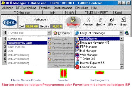 Durch Start von Internet Programmen oder Favoriten mittels des DFÜ-Managers, werden die Internetgebühren erfasst und es wird vor fremden Eingriffen geschützt. Überprüfung der Liste der DFÜ-Verbindungen weist auf Fremdverbindungen oder teure 0190er DFÜ-Verbindungen hin.