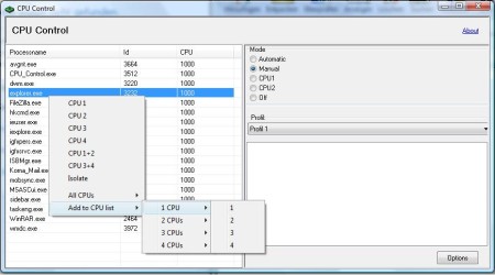CPU-Control ist ein Programm um die Prozesszuweisung zu automatisieren. Also anstatt, dass jeder Prozess bei einem Multicore-System auf beiden CPUs läuft kann man das System auch geziehlt optimieren indem man z.B. das Antivirenprogramm und die Firewall auf CPU1 und das Graphikprogramm auf CPU2 legt.Ingesamt hat CPU-Control fünf unterschiedliche Modi.