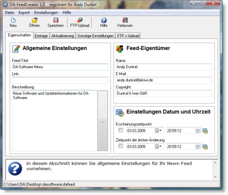 Mit DA-FeedCreator erstellen Sie RSS-News-Feeds für Ihre Homepage, einfach und schnell ohne komplizierte Bearbeitung von Quelltexten. Sie legen einmal die Einstellungen für den Newsfeed fest und können dann jederzeit Newseinträge hinzufügen, bearbeiten und wieder entfernen. Dank dem integrierten FTP-Upload wird der Newsfeed per Knopfdruck auf Ihre Homepage übertragen und steht sofort zur Verfügung.