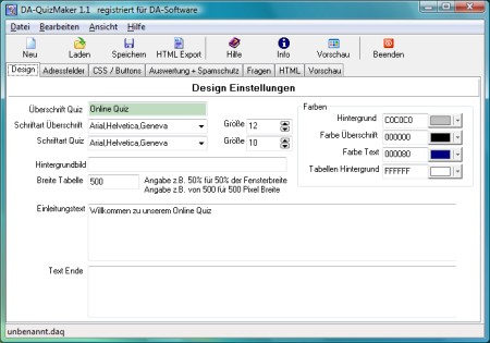 Mit dem DA-QuizMaker erstellen Sie auf leichte und schnelle Weise Online-Quiz und Online-Tests für Ihre Homepage. Die Tests werden automatisch ausgewertet und die Ergebnisse können dem Benutzer angezeigt werden. Sie benötigen keine tiefgehenden HTML Kenntnisse und Ihr Webspace braucht keine CGIs! Farben, Felder, Einstellungen alles kann bequem über die Programmoberfläche konfiguriert werden.