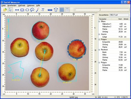 Das Messprogramm Datinf® Measure verfügt über vektorbasierte Messobjekte, die ähnlich der Anwendung in Zeichenprogrammen über das Originalbild gelegt werden. Alle Messobjekte können als Messdatei gespeichert und zu einem späteren Zeitpunkt weiter bearbeitet werden. Unterstützt wird der direkte Export der Messergebnisse über die Zwischenablage oder als Exceldatei. Die Software funktioniert mit Bildern unterschiedlicher Auflösungen und Formate.