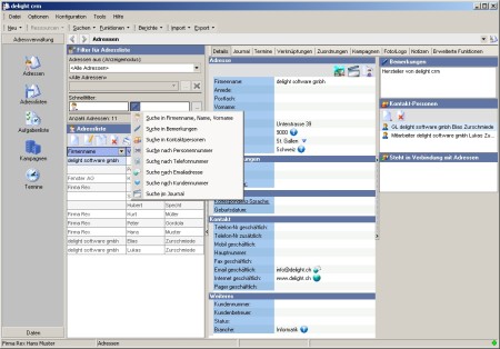 delight crm ist das perfekte Werkzeug für Unternehmen, Vereine und Selbständigerwerbende, die flexiblen und schnellen Zugriff auf Adressdaten, Korrespondenzen, Kampagnen, Dokumente, Termine, Aufgaben, Emails, SMS, Briefe, Rechnungen, Aufträge, Berichte usw. benötigen. Es können detaillierte Adressdaten erfasst, ein Foto oder Firmenlogo, Dokumente, Notizen und Bilder hinterlegt und ein ausführliches Journal auf jeder Adresse geführt werden.